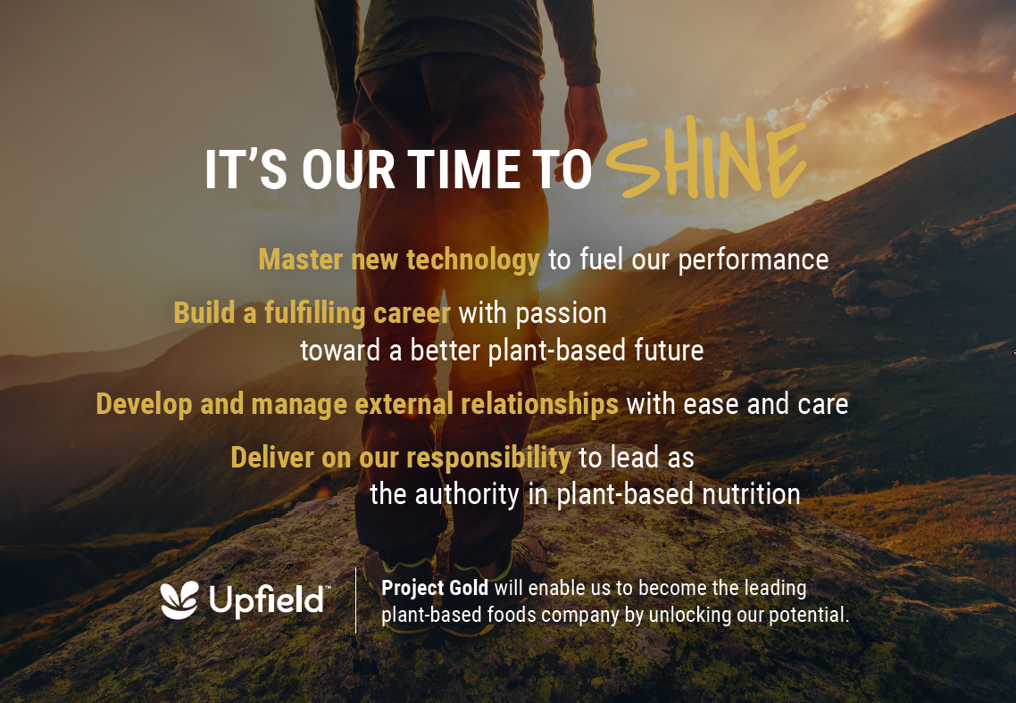 Due to the significant nature of change, my strategy focused on creating an ambitious company-wide narrative and a communications framework that enabled regions to articulate the transformation journey at a local level. To bring to life the company-wide narrative, I developed a bold brand for the transformation programme (‘Going for Gold’ – see visuals here) and core programme messaging. I created a company-wide content calendar that ensured the programme was at the centre of peoples’ minds, with monthly company-wide townhall presentations delivered by the company CEO, company-wide articles that explained how the programme was crucial to Upfield’s Mission, Vision and Purpose, and a series of leadership videos.